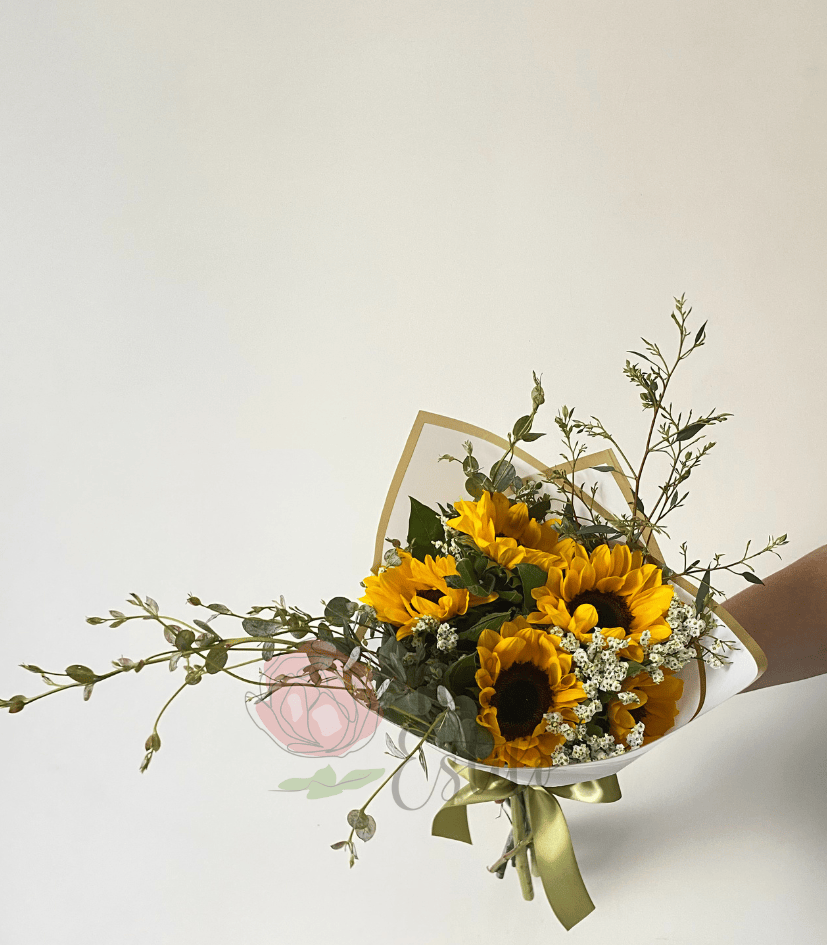Ramo Evita. 5 Girasoles y limonium en ramo.