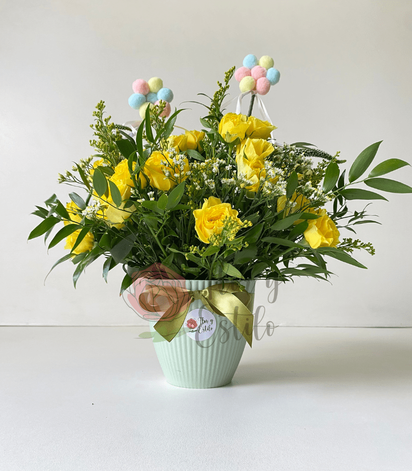Arreglo René. minirosas y solidago en maceta.