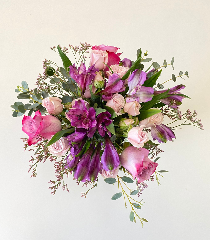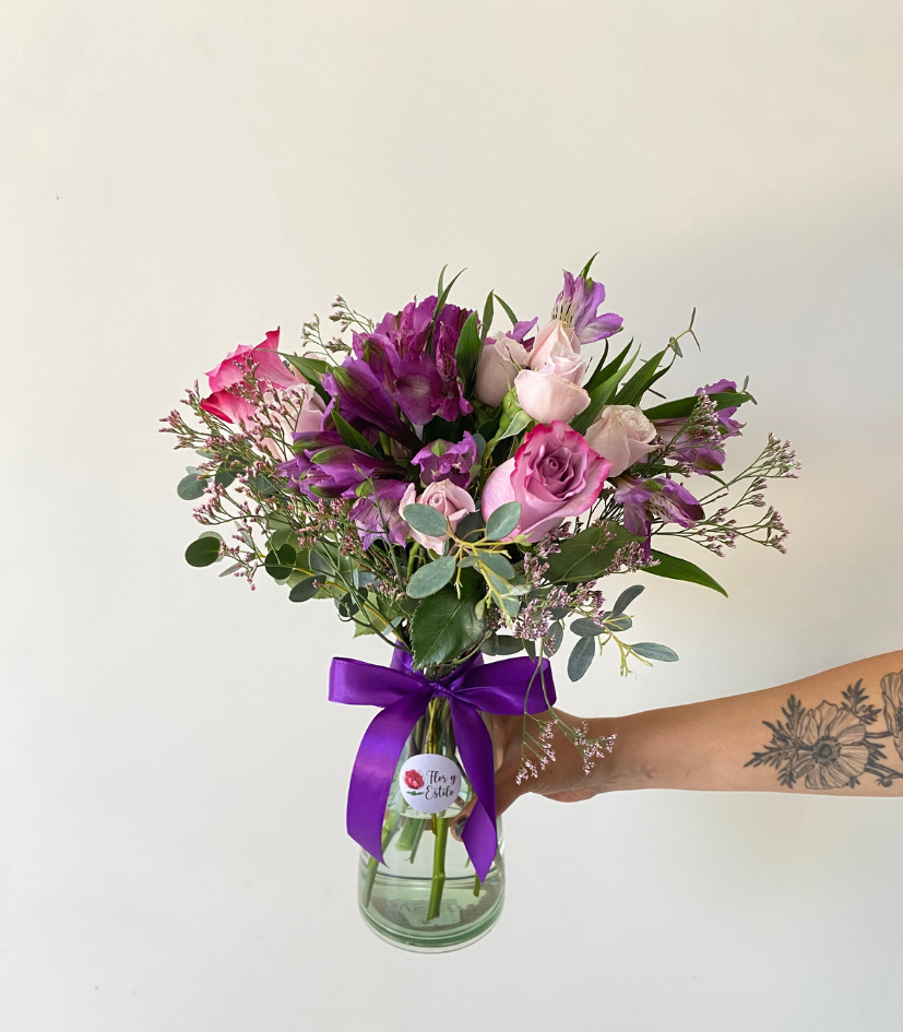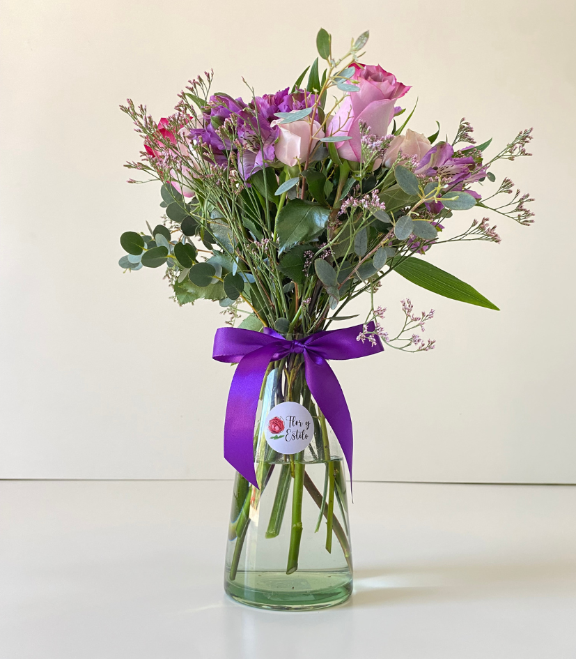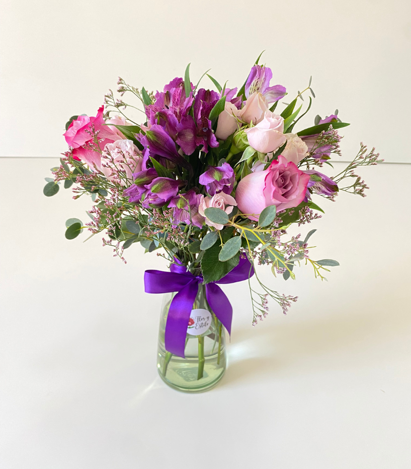 Florero Camila en lila. Minirosa y alstroemeria en florero.