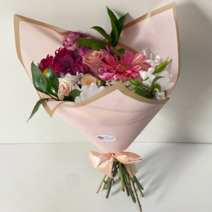 Florero Mariana. Gerberas y mini rosas en florero.