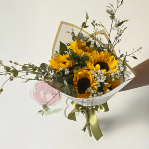 Ramo Evita. 5 Girasoles y limonium en ramo.