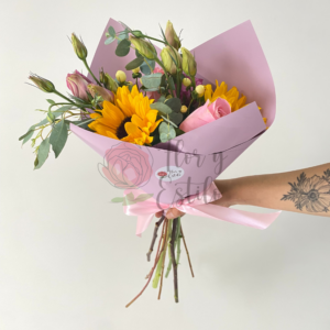 Canasto Andrea. Lisianthus y rosas en canasto.