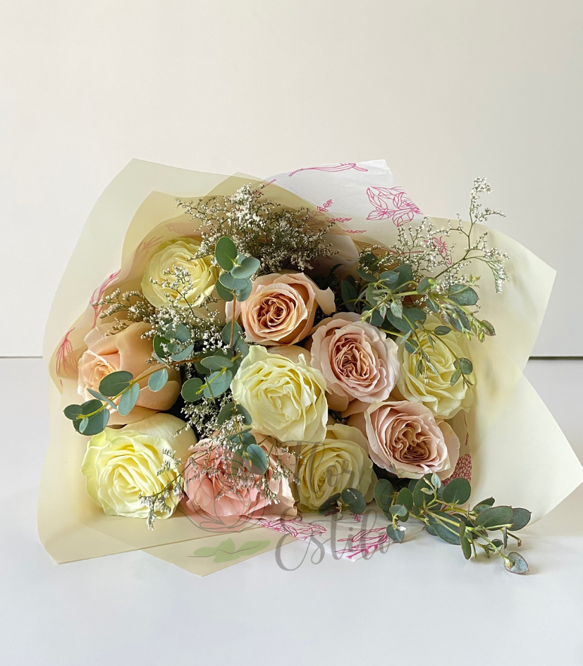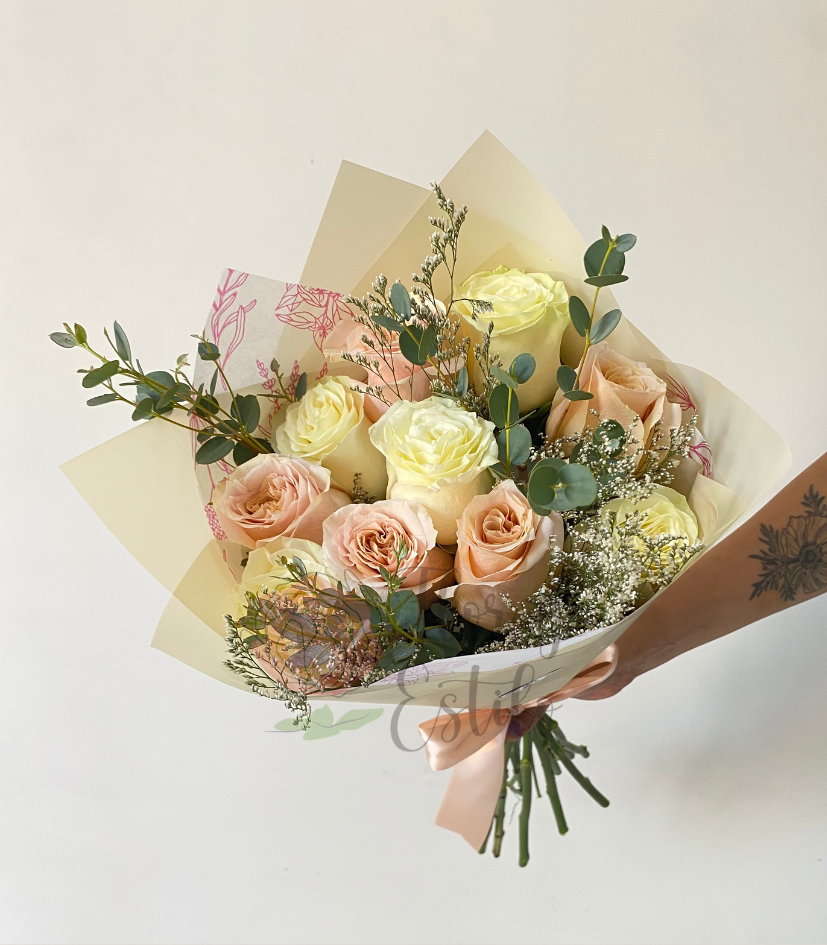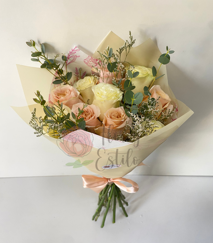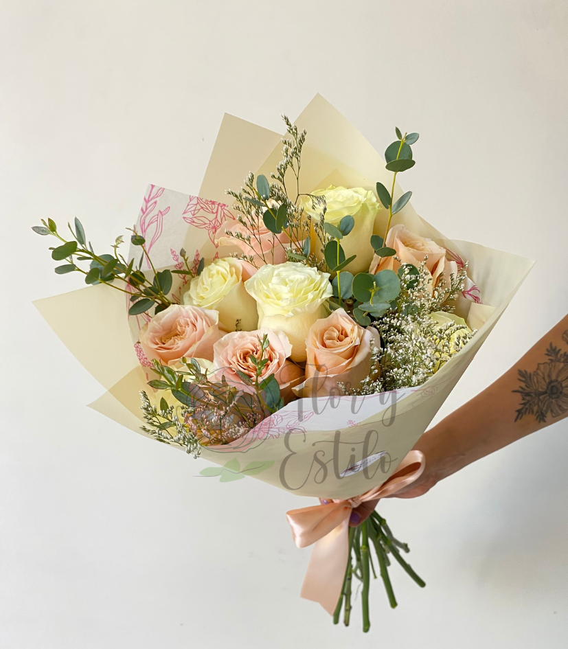 Hermoso ramo de 10 rosas, blancas y damasco, será el favoritos de todos.