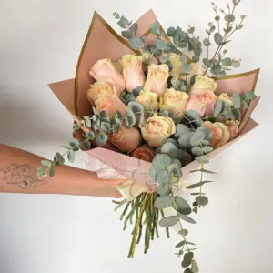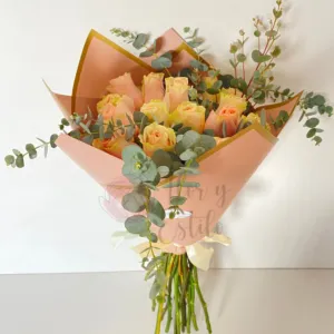 Ramo Ana. 12 Rosas rosadas y eucaliptus en ramo.